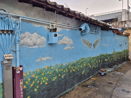 주차장 앞 벽화는 특정 디자인이 아닌 풍속화풍으로 그려야 해서 온전히 대표님이 엄청 고생하셨습니다.